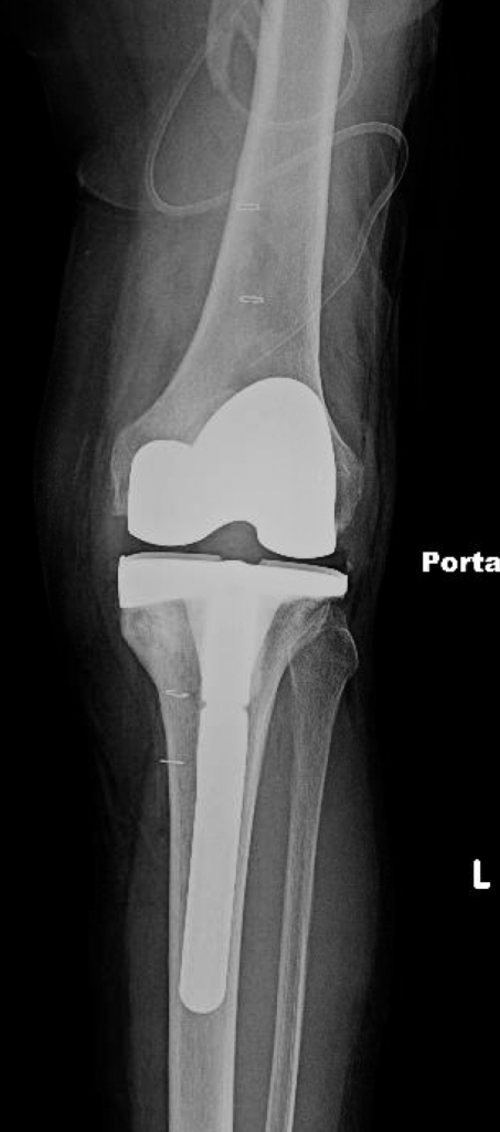 She underwent complex TKA reconstruction. A medial tibial reduction osteotomy and careful medial soft tissue release was performed to balance the knee, so that only a posterior stabilized (PS) insert was necessary. A stem with hybrid fixation was used on the tibial side with a wedge augment in the medial defect.